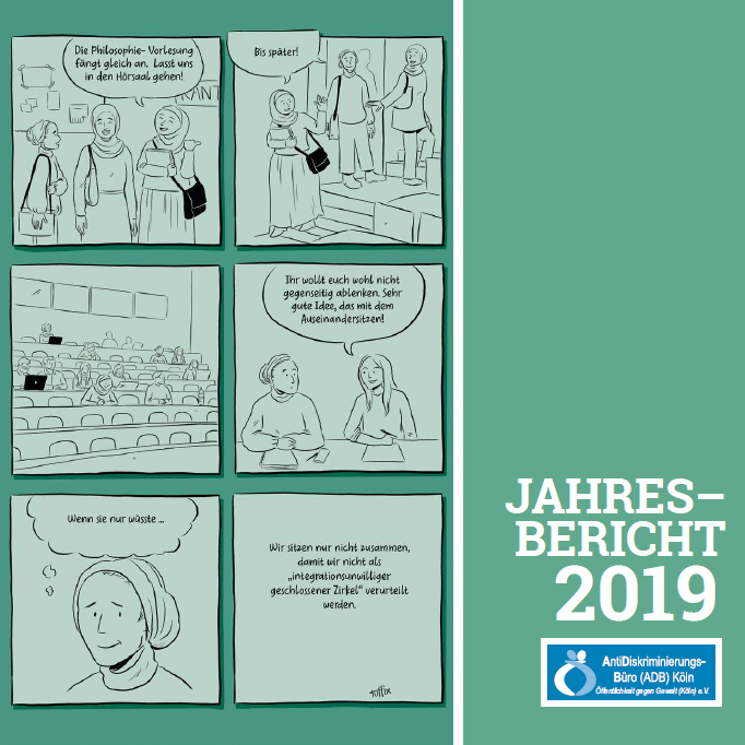 Aus diesem Grund bietet das ADB Köln des Vereins Öffentlichkeit gegen Gewalt e.V. neben der Beratung zu konkreten Diskriminierungsfällen verstärkt Veranstaltungen und Angebote für Menschen mit Rassismuserfahrungen an. Eines dieser Angebote richtete sich explizit an Menschen, die von anti-muslimischem Rassismus betroffen sind. Daraus entstand das Titelbild des diesjährigen Berichts. Die Künstlerin und Psychologin Soufeina Hamed, die den Workshop leitete, illustrierte diese Geschichte einer Teilnehmerin.